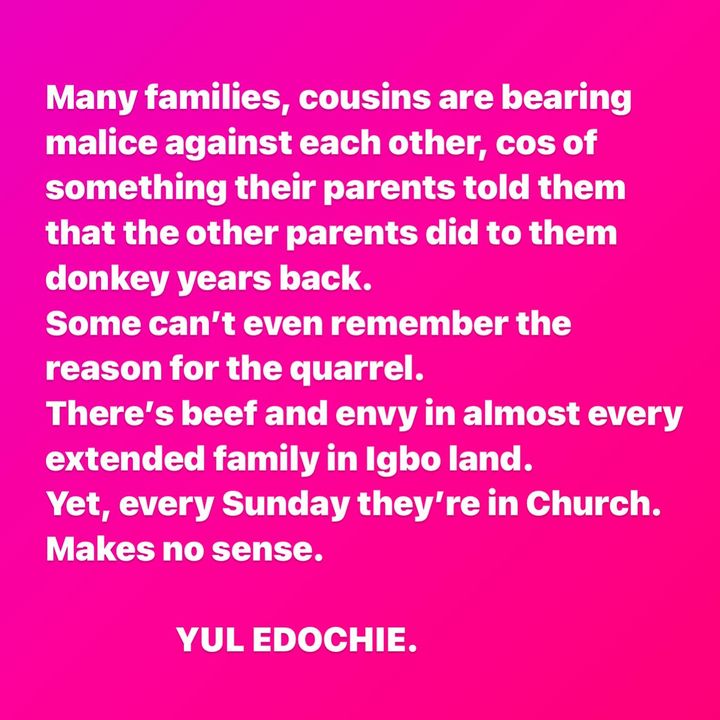His words: “Many families, cousins are bearing malice against each other, cos of something their parents told them that the other parents did to them donkey years back. Some can’t even remember the reason for the quarrel. There’s beef and envy in almost every extended family in Igbo land. Yet, every Sunday they’re in Church. Makes no sense.”